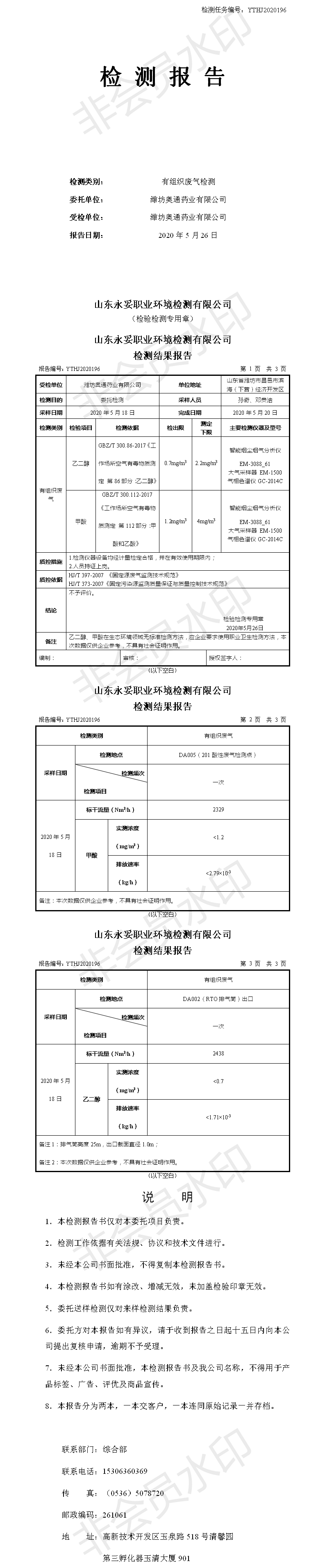 濰坊奧通藥業(yè)有限公司五月環(huán)境檢測(cè)報(bào)告