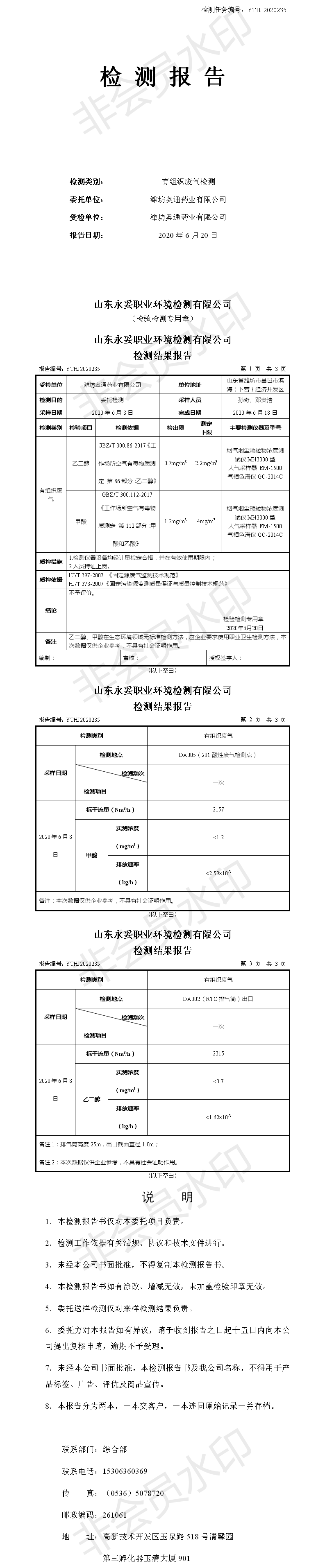 濰坊奧通藥業(yè)有限公司六月環(huán)境檢測報告