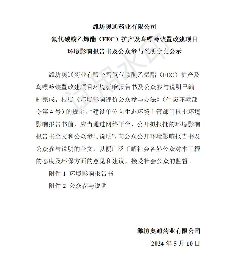 濰坊奧通藥業(yè)有限公司氟代碳酸乙烯酯(FEC)擴產(chǎn)及鳥嘌呤裝置改建項目第三次公示
