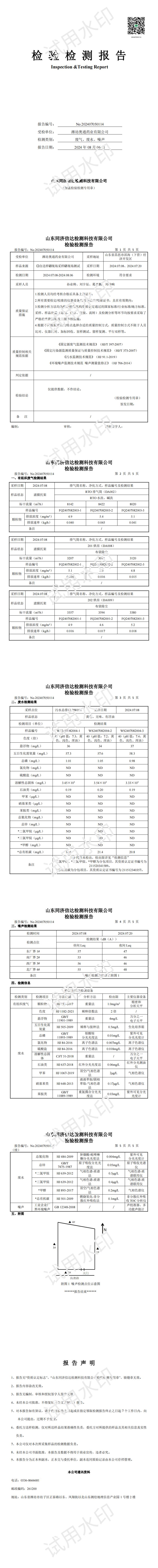 濰坊奧通藥業(yè)有限公司七月環(huán)境檢測(cè)報(bào)告