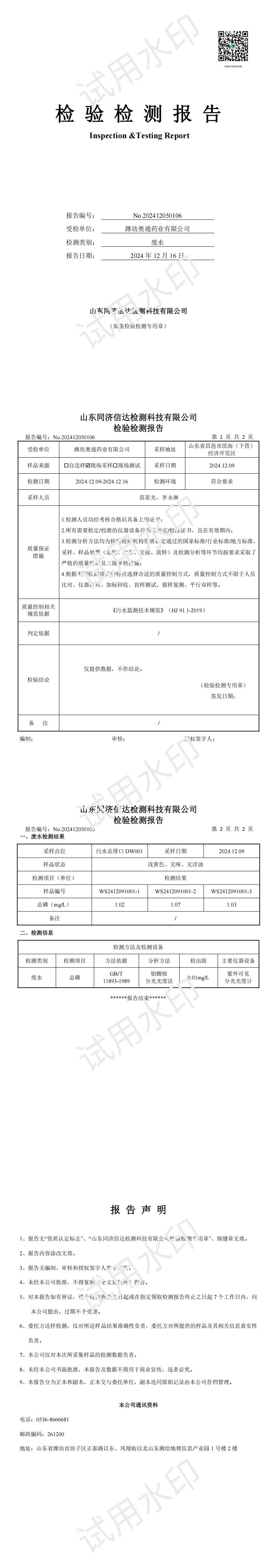 濰坊奧通藥業(yè)有限公司十二月環(huán)境檢測報告